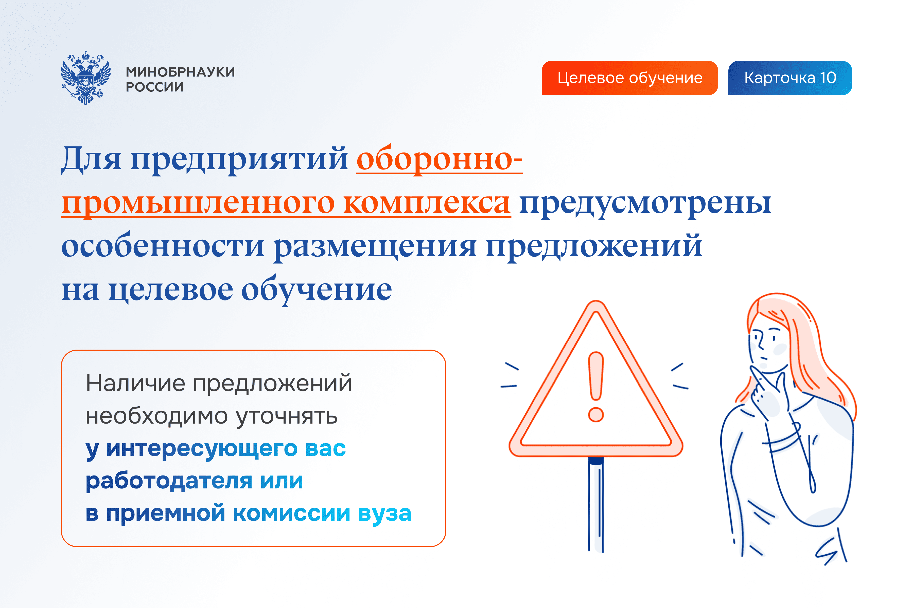 Для предприятий оборонно-промышленного комплекса, включенных в специальный перечень, предусмотрены особенности формирования предложений о заключении договоров о целевом обучении. Наличие предложений необходимо уточнять у интересующего вас заказчика или в приемной комиссии вуза.